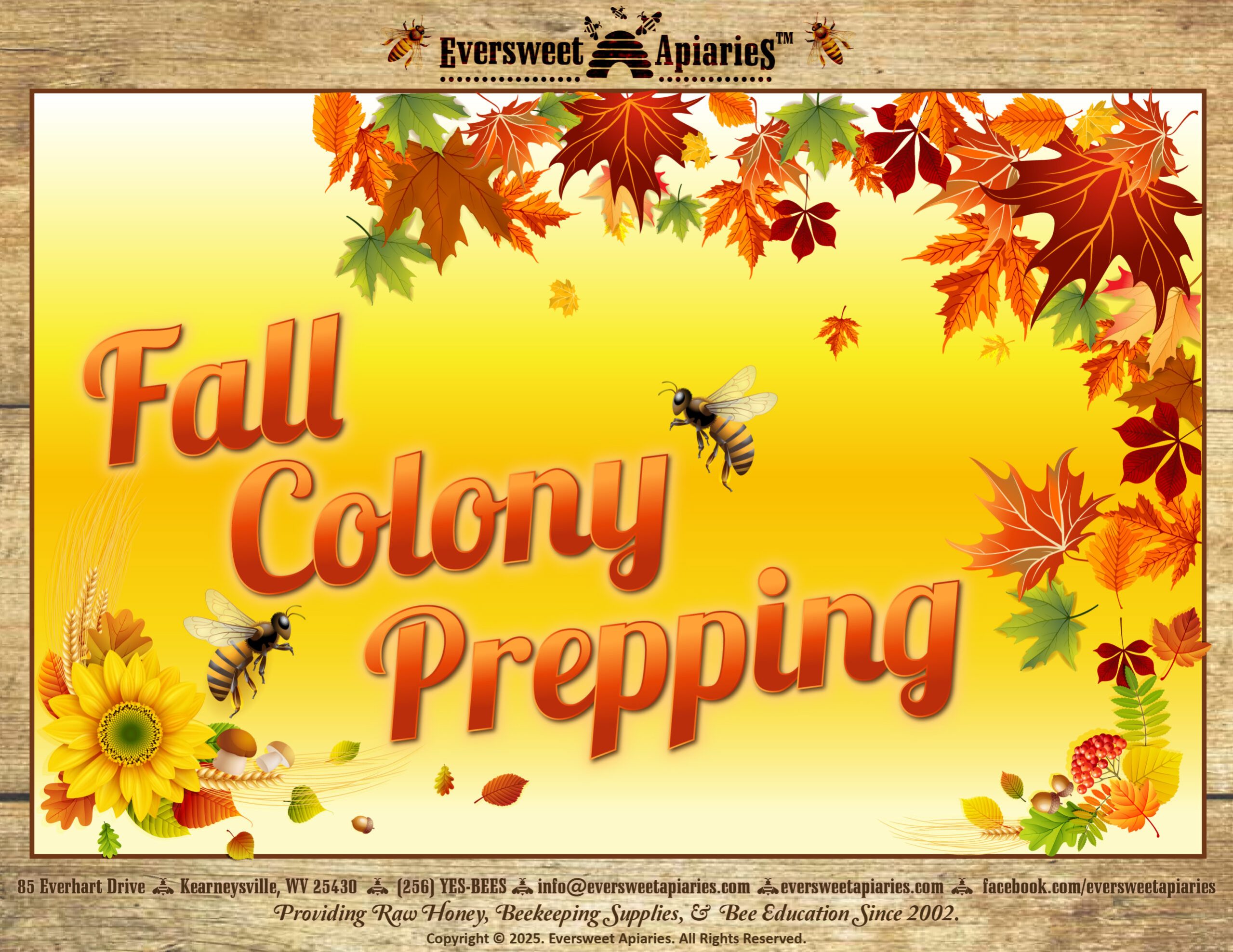 Please contact us by email (info@eversweetapiaries.com), Facebook (www.facebook.com/eversweetapiaries), or phone (256-YES-BEES) with any questions.